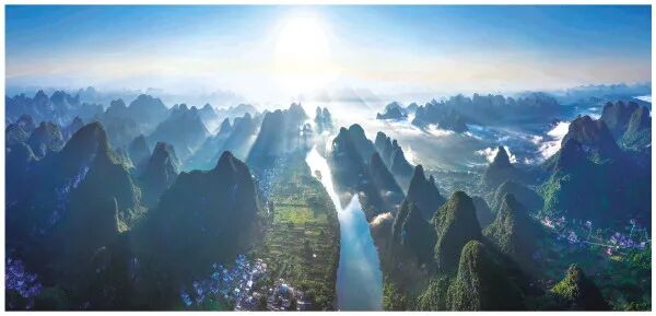 8月28日清晨7时,朝阳的光路从喀斯特峰林之间倾泻而出,云雾退作柔纱,碧水浮光跃金,山峦的缝隙成了天地交接的镜廊。在漓江的晨曦中,我们能看见光如何用脚步丈量山水的高度。(唐艳兰 摄)